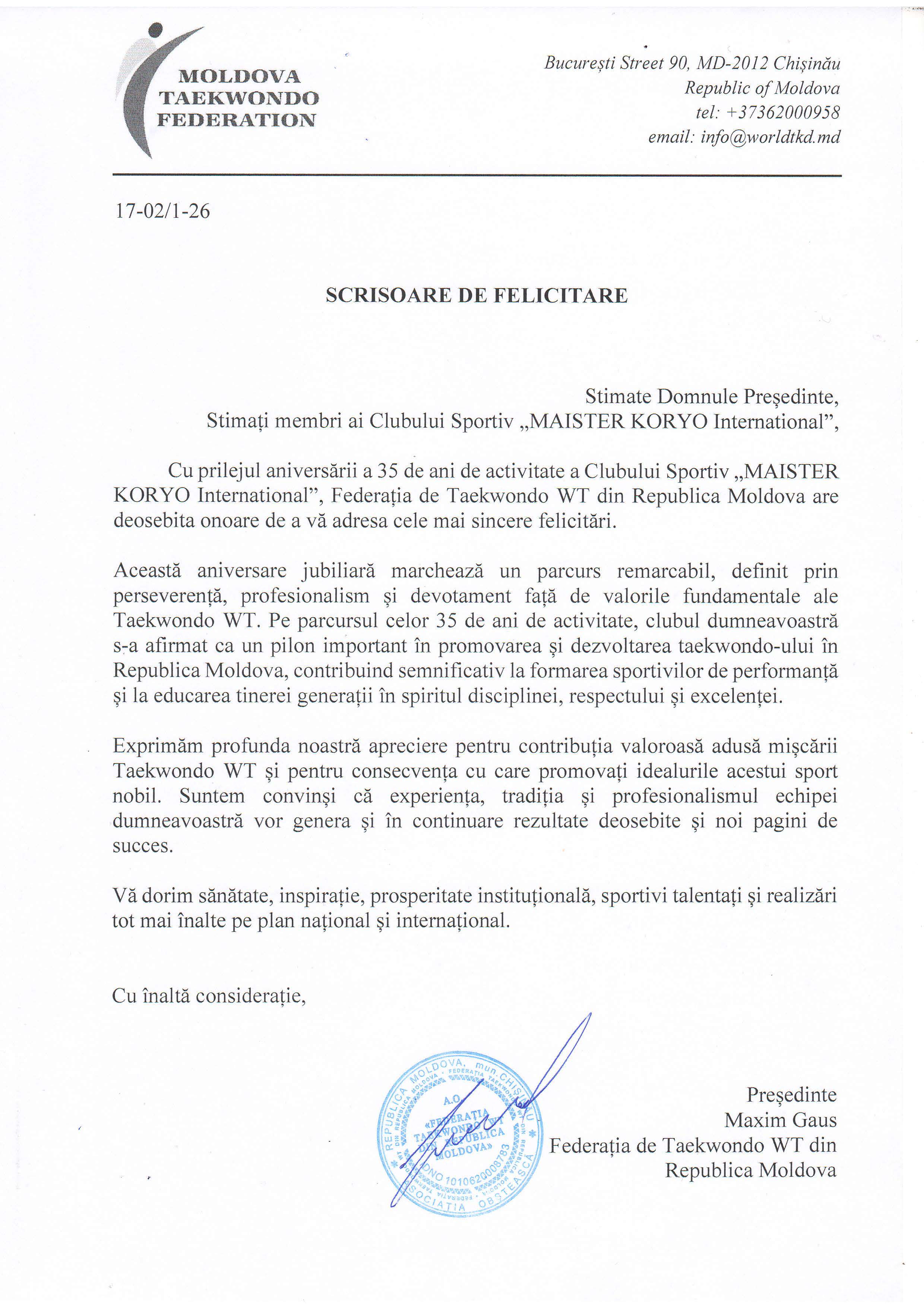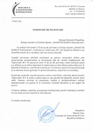 Поздравительное письмо Президента Федерации Тхэквондо WT Республики Молдова (FTM) по случаю празднования 35-летия со дня основания Клуба "KORYO" - сейчас "MAISTER KORYO International".